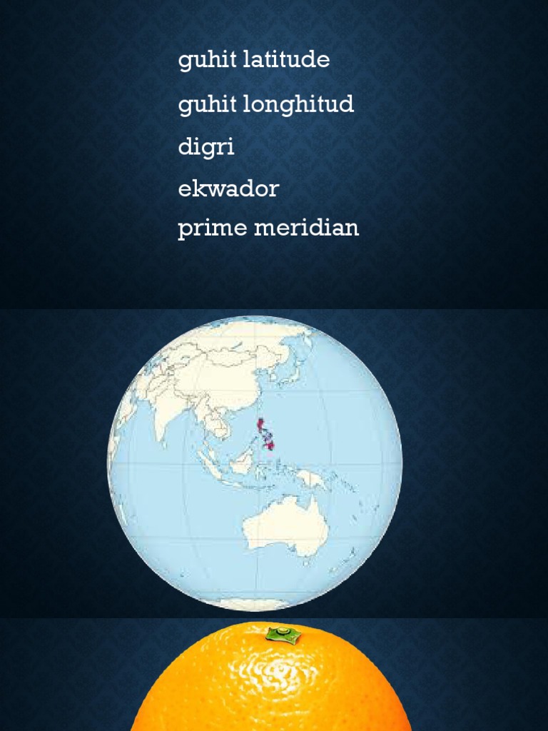 Pinag samang guhit latitud. Ang bilog ay may kabuuang 360. Ano ang pagkakaiba ng globo at mapa.