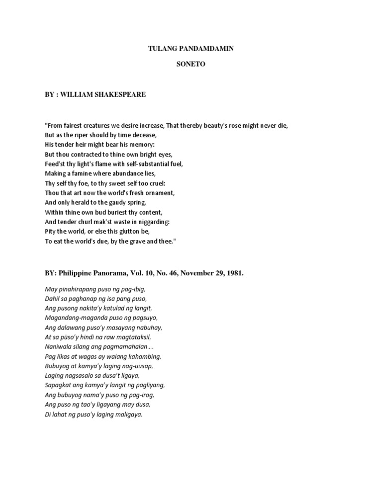 Jul 15 2015 Ang soneto ay isang tulang liriko na may 14 na taludtod. Ang mga tula ni William Shakespeare kilalang manunulat at makatang Ingles na kanyang isinalin sa wikang Filipino. Elehiya isang tulang malungkot at pagdadalamhating babasahinAng karaniwang tema nito ay kamatayan o pagluluksa.