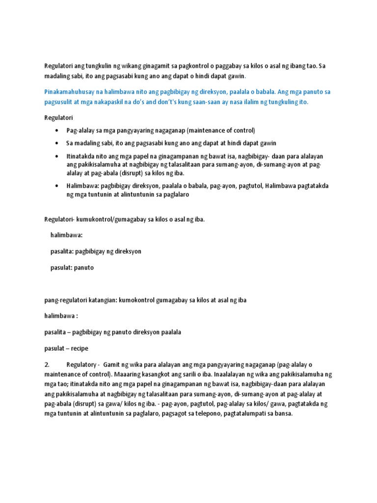Gamit ang wika bilang regulatoryo nagkakaroon siya ng kontrol sa pag aasal ng sarili at sa kaniyang kapwa. Ang Regulatori na Tungkulin ng Wika Halimbawa. Mga Halimbawa ng Regulatoryo.