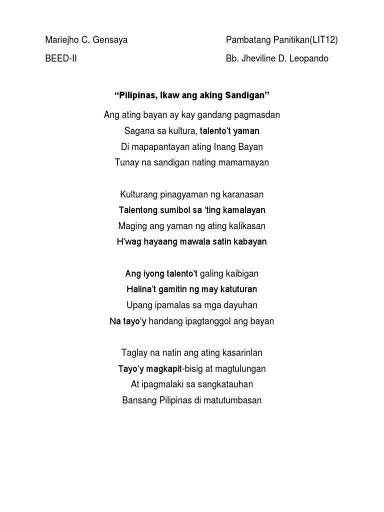 Tula ko sanay magustuhan Sa ating bansa ay lumisan. Pagmamahal ninyoy nagsilbing lakas ko. Aking mga magulang kami ay minahal.