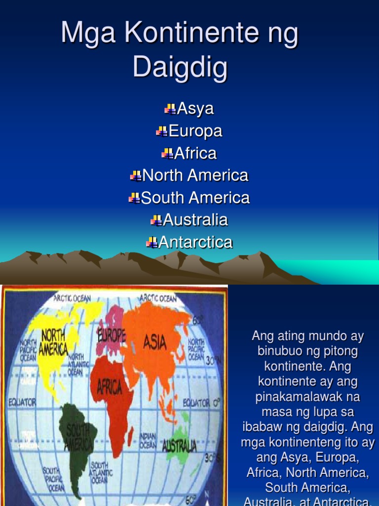 Ito ang pumapangalawa sa Asya na ang pinakamalaking kontinente. Ang haba ng hayop - 50 cm at ang taas sa Withers. Ito ay binubuo ng ibat ibang bansa na kadalasan ay naisusukat o naitatangi dahil sa kultura tradisyon nitoPito ang kontinenteAng mga pitong kontinente ayasiaeuropaafricaaustralianorth americasouth americaantarticaAnother AnswerAng kontinente ay ang malaking kalupaan sa mundo eto ung bumubuo sa daigdig.