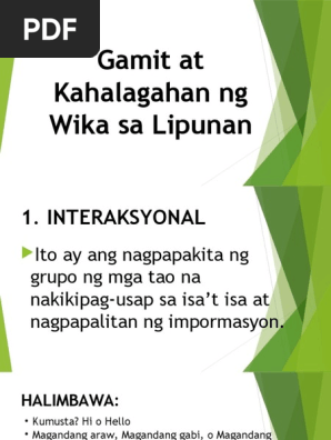 Uunahin natin alamin kung ano talaga ang kahulugan ng wika. Heuristic Gamit ng wika bilang kagamitan sa pagkatuto ng mga kaalaman at pag-unawa. Pasalitang Paraan - Pormularyong panlipunan 2.