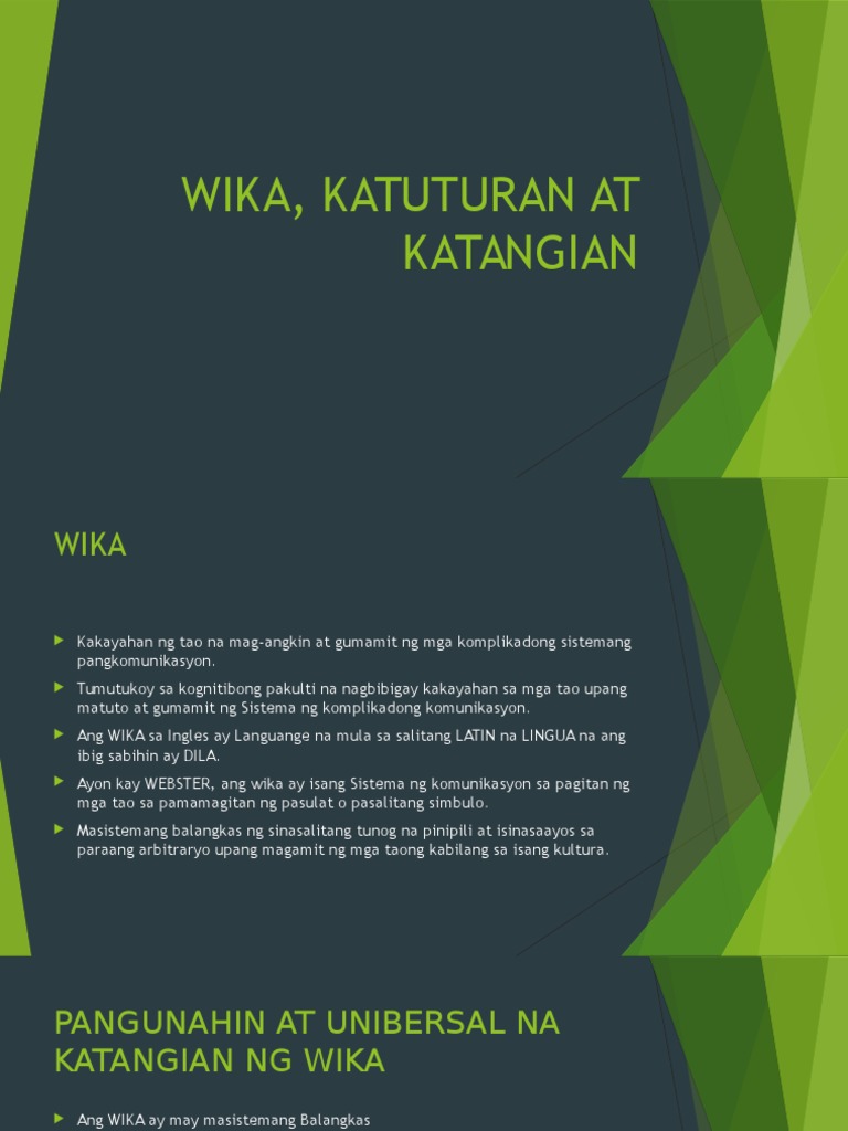 Hindi na kailangan pang antayin na mapagyaman idebelop o madebelop pa ang ating wika. KATANGIAN NG WIKA 1. Ang wika ay nakabuhol sa kultura Pinatutunayan lamang na walang superyor na wika sapagkat ang bawat wika ay may sariling kakanyahang kultural.